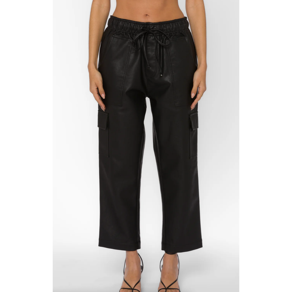 These faux leather cargo pants feature a drawstring waist for a customized fit and are crafted from faux leather with a structured feel and a matte finish.